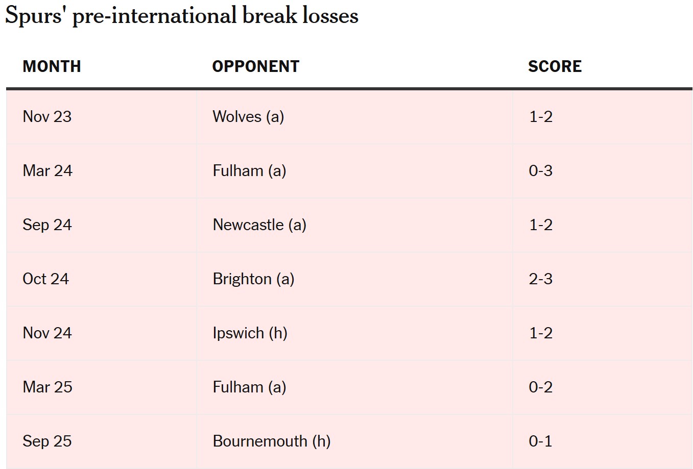 更令球迷不安的是,弗兰克似乎继承了前任波斯特科格鲁的一段“怪异魔咒”:据The Athletic统计,在国际比赛日前的最后一轮,热刺总是输球。从2023年11月客场1-2不敌狼队开始,到上个月主场0-1输给伯恩茅斯,热刺已经连续七次在国家队比赛前吞下失利。