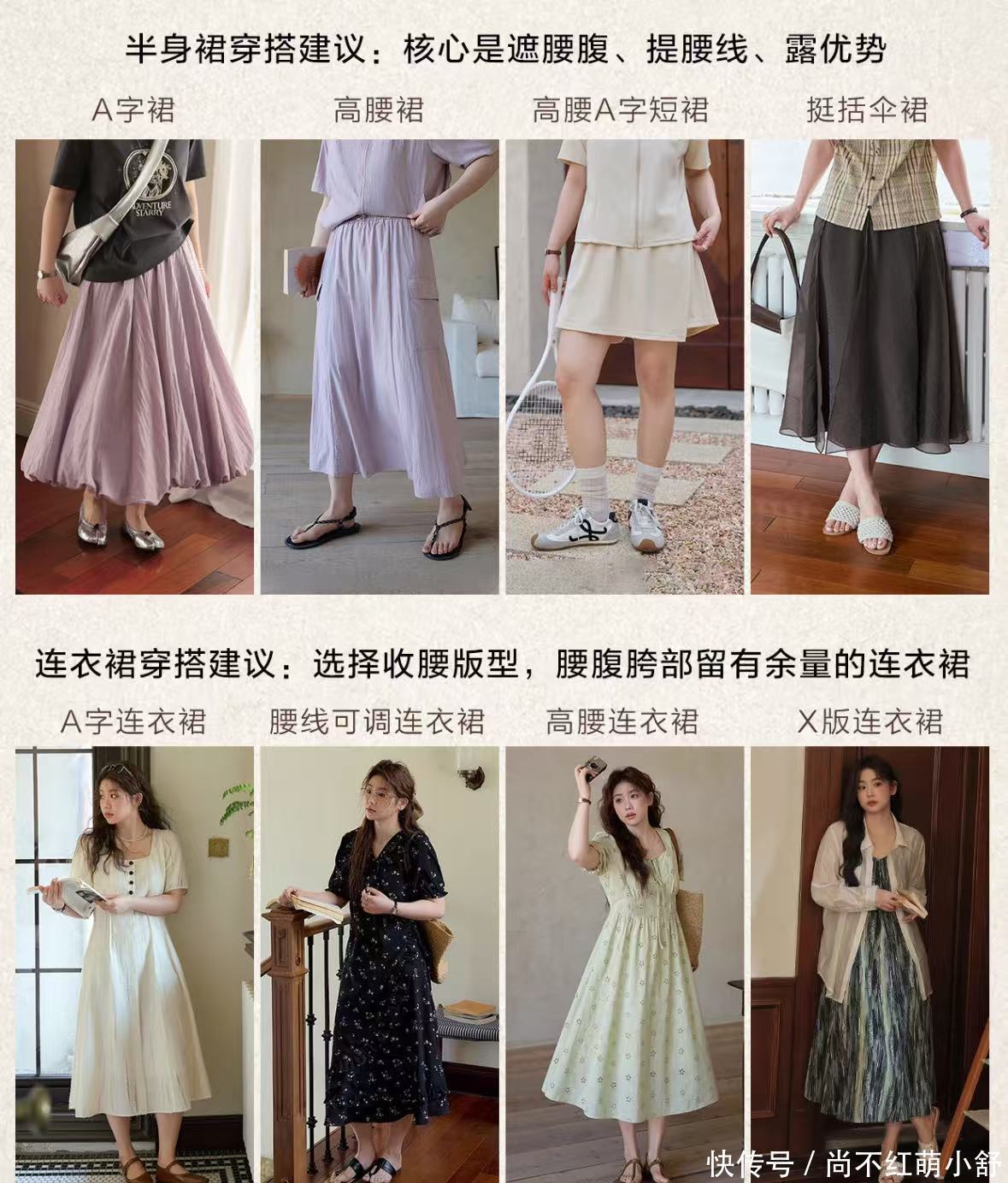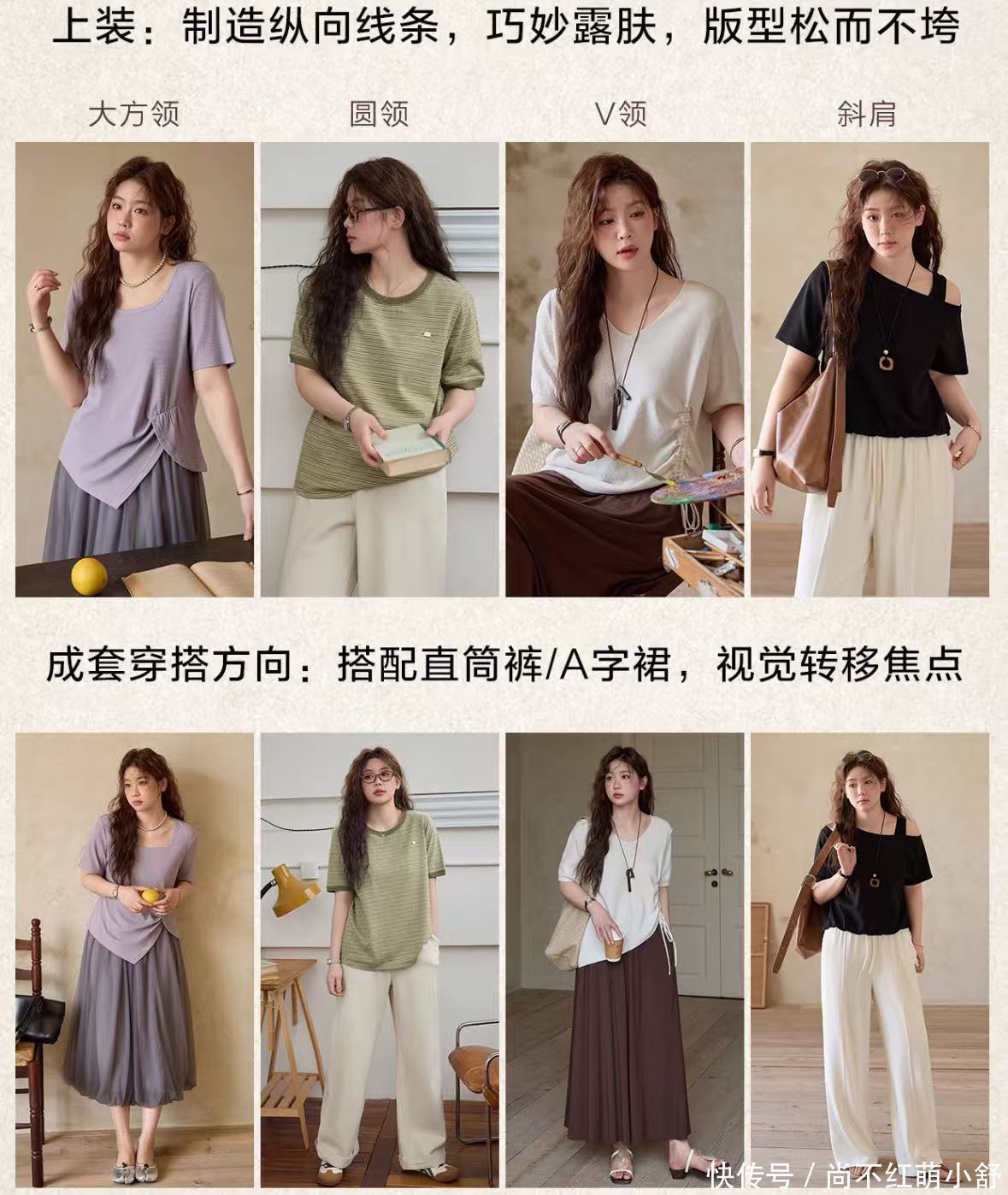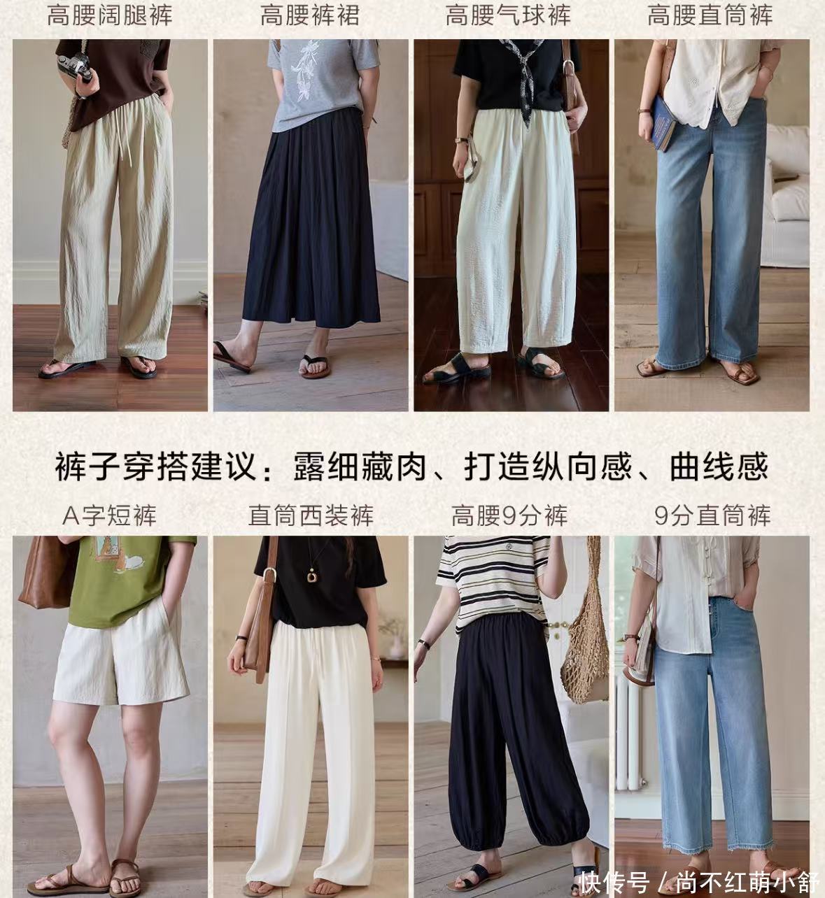 核心任务: 制造纵向线条,修饰腰腹,显高显瘦。上装: V领/U领、垂坠感好的衬衫、H型短外套。避免紧身和腰部有复杂装饰的上衣。下装: 直筒裤、烟管裤、微喇裤。露出脚踝更显瘦。高腰线是关键,但需通过外套或略有松度的连衣裙的剪裁来实现,而非勒紧的腰带。