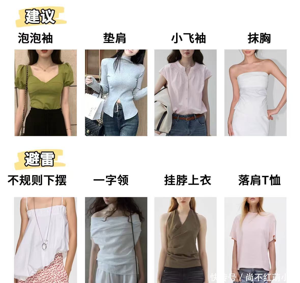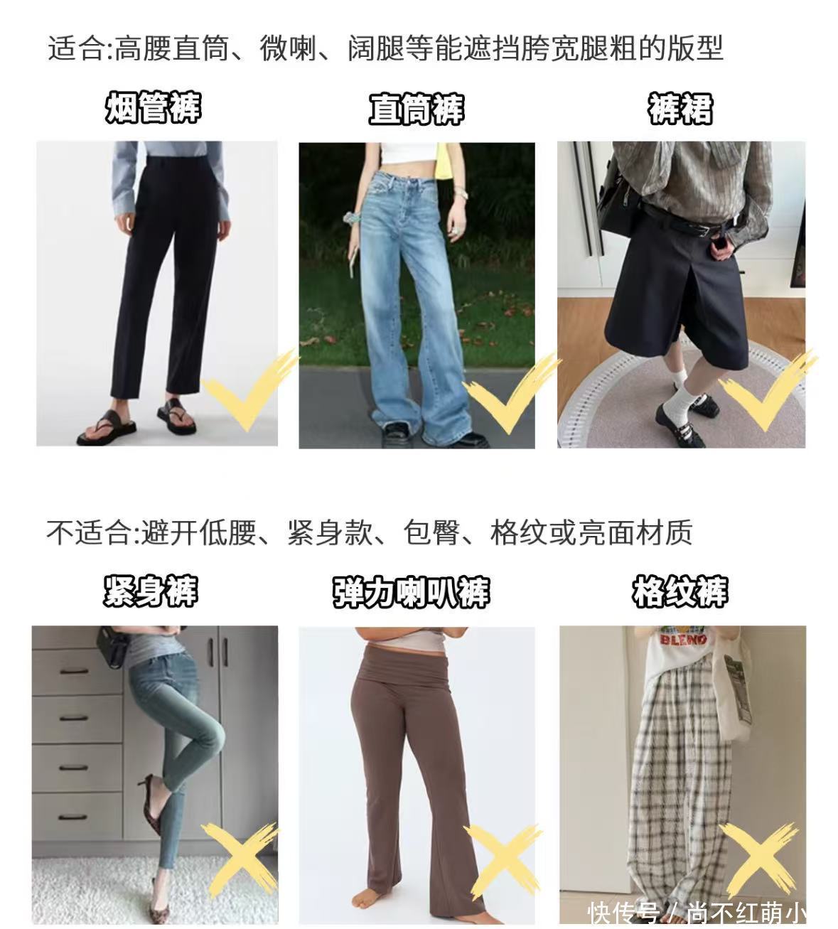核心任务: 突出上半身,模糊臀腿,平衡上下比例。上装: 修身或略有设计感(如V领、泡泡袖)的针织衫、衬衫,将视觉焦点上移。下装: A字半裙、阔腿裤、直筒裤。选择深色、垂坠感好的面料。避免紧身裤和浅色包臀裙。