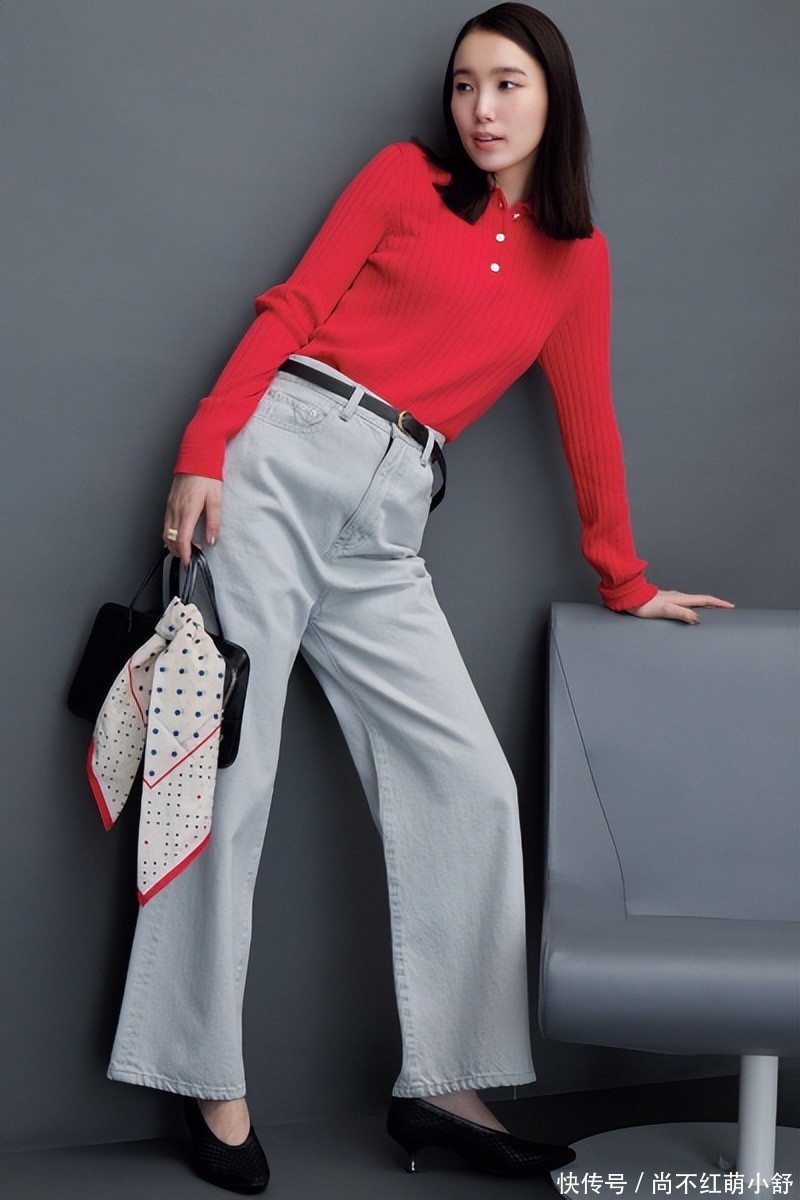 look5、polo红色针织衫+高腰灰色牛仔裤