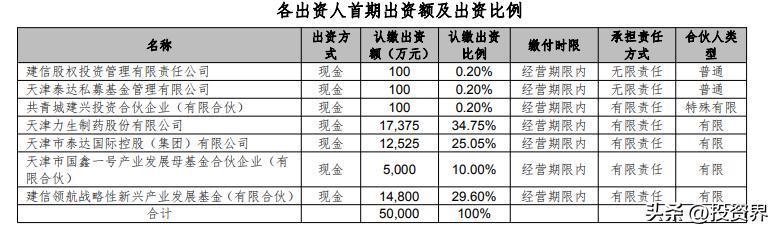 基金总规模为 10 亿元,首期出资人民币 5 亿元。其中,力生制药参与基金首期设立,出资额为 1.7375 亿元,占认缴出资比例的34.75%。基金存续期仅为5年,其中投资期两年,退出期3年,经管理人提出并经全体合伙人一致同意,管理人可再决定延长合伙企业的经营期限。