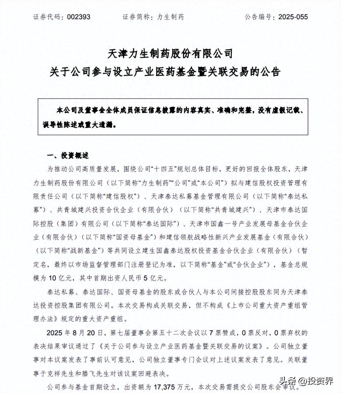 投资界(ID:pedaily2012)消息,近日,天津力生制药股份有限公司(以下简称“力生制药”)发布公告称,拟与建信股权、天津泰达私募基金、共青城建兴投资、天津市泰达国际、天津市国鑫一号产业发展母基金和建信领航战新基金等共同设立建生国鑫泰达股权投资基金合伙企业(有限合伙)(暂定名)。