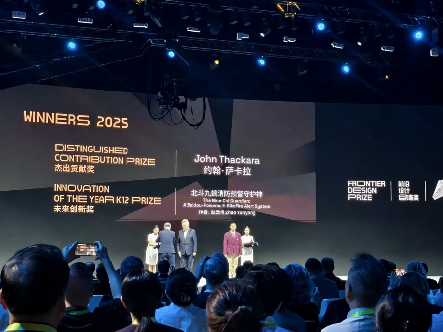 2025“前沿设计创新奖”分设杰出贡献奖和未来创新奖,杰出贡献奖的获奖者为可持续设计专家、英国皇家艺术学院院士约翰·萨卡拉(John Thackara),由他发起并持续举办20年的“感知之门”国际会议,已成为该领域的重要交流平台。未来创新奖的获得者为上海市田林第三中学学生赵云杨,他因设计北斗九螭消防预警守护神而获奖。